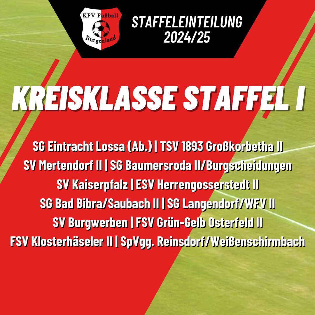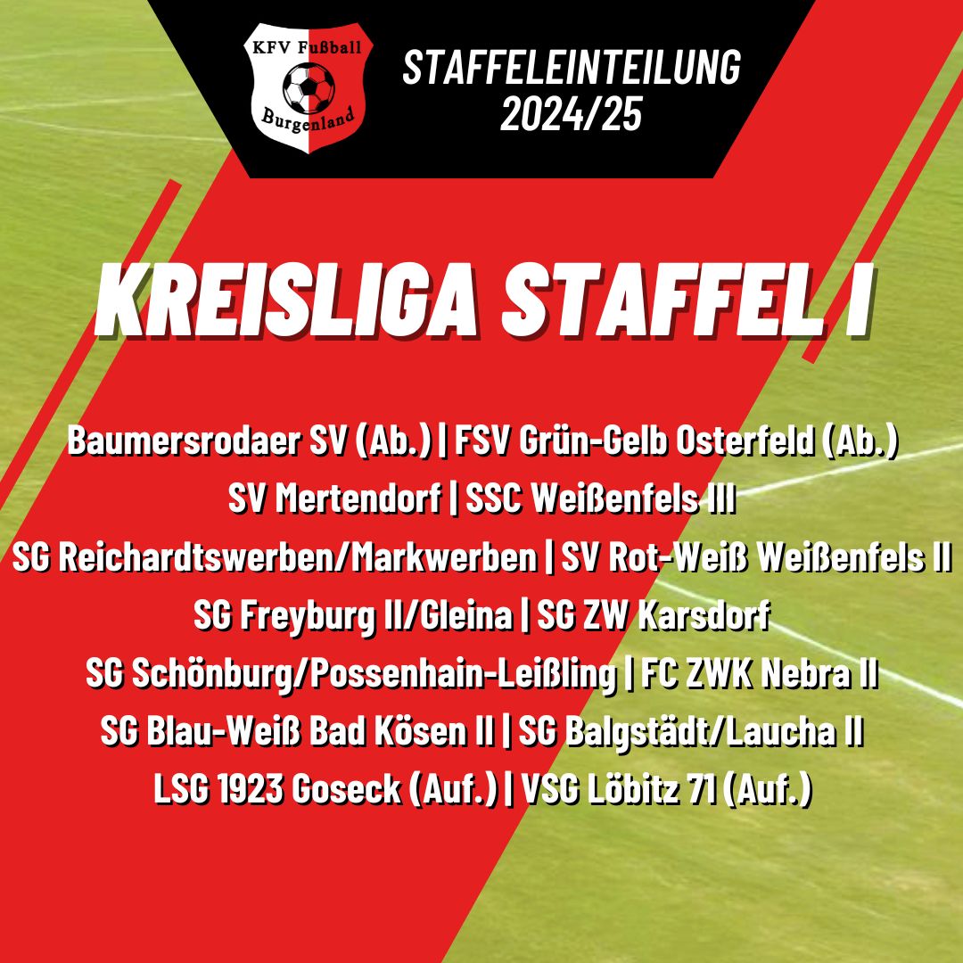 Wie bereits in der Vorsaison wird auch in der aktuellen Spielzeit in zwei Kreisliga-Staffeln gespielt. Hierfür haben sich 27 Teams angemeldet. Die vier Absteiger aus der Kreisoberliga wurden zu zwei Paaren stimmig in die Spielklassen sortiert. So treten der Baumersrodaer SV und der FSV Grün-Gelb Osterfeld in Staffel I an. Die Teams des SV Eintracht Profen und des SV Blau-Weiß Grana werden in die Staffel II eingegliedert.