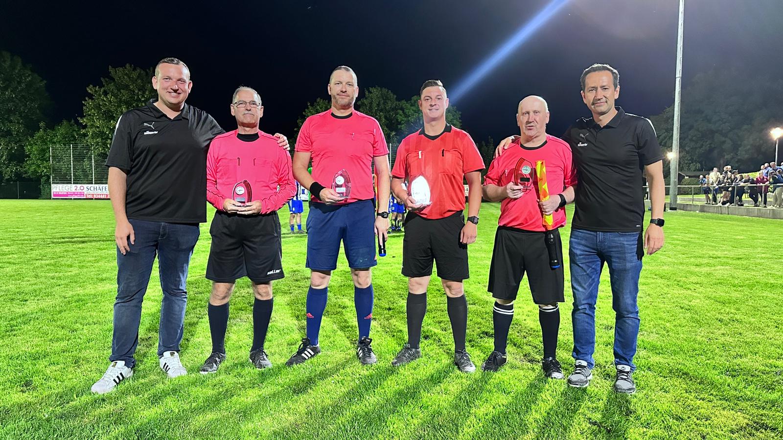 Schiedsrichter Daniel von Nessen (3.v.r.) leitet die Partie gemeinsam mit seinen Assistenten Mathias Kruse (2.v.r.) und Norman Spräte (3.v.l.). Als Vierter Offizieller agierte Uwe Löber